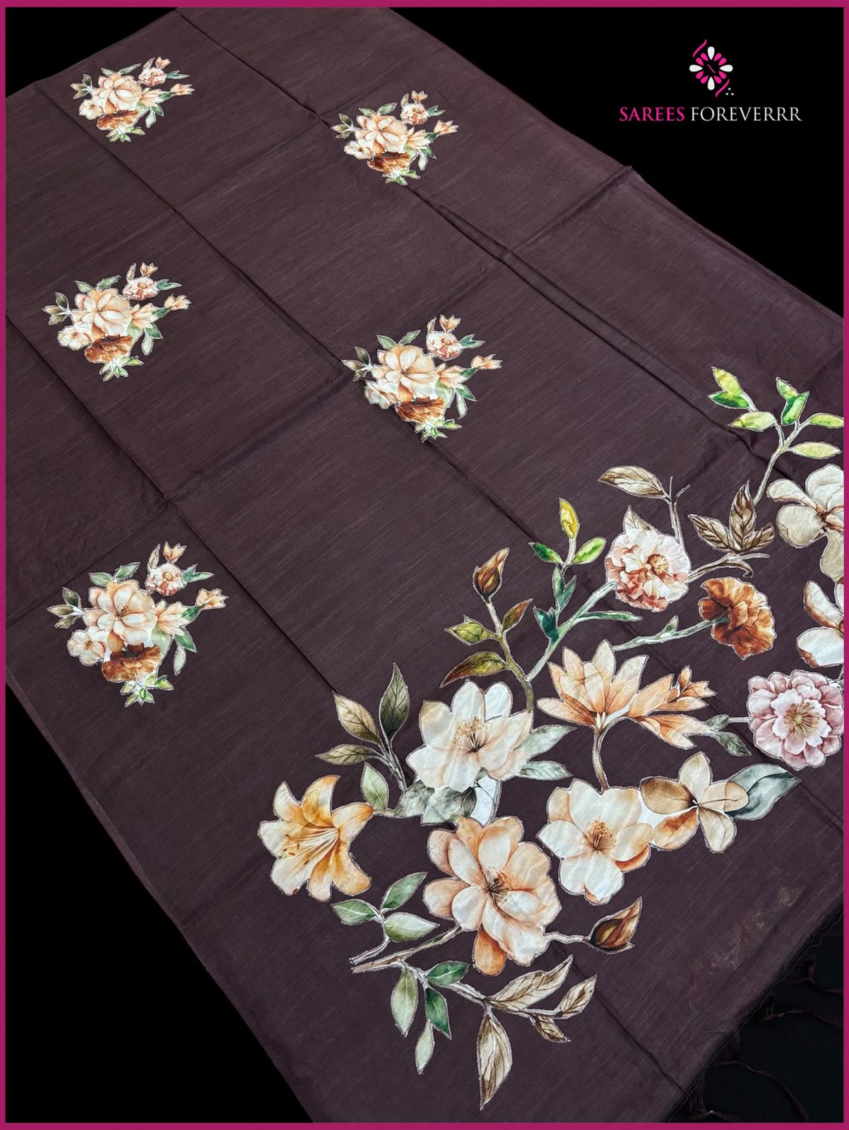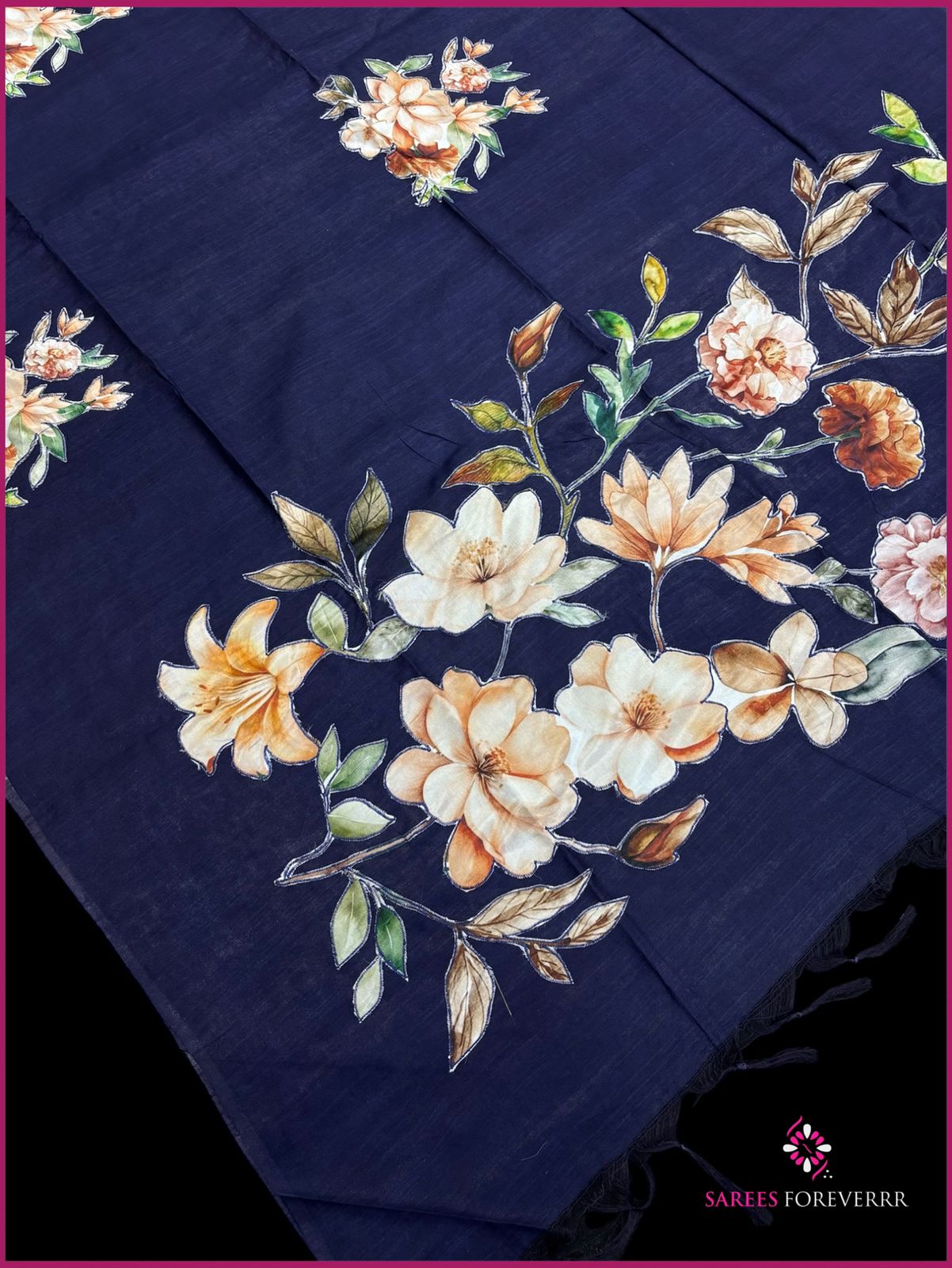 Crafted on soft handloom fabric, this saree features beautifully detailed appliqué floral motifs that add an elegant, handcrafted charm.